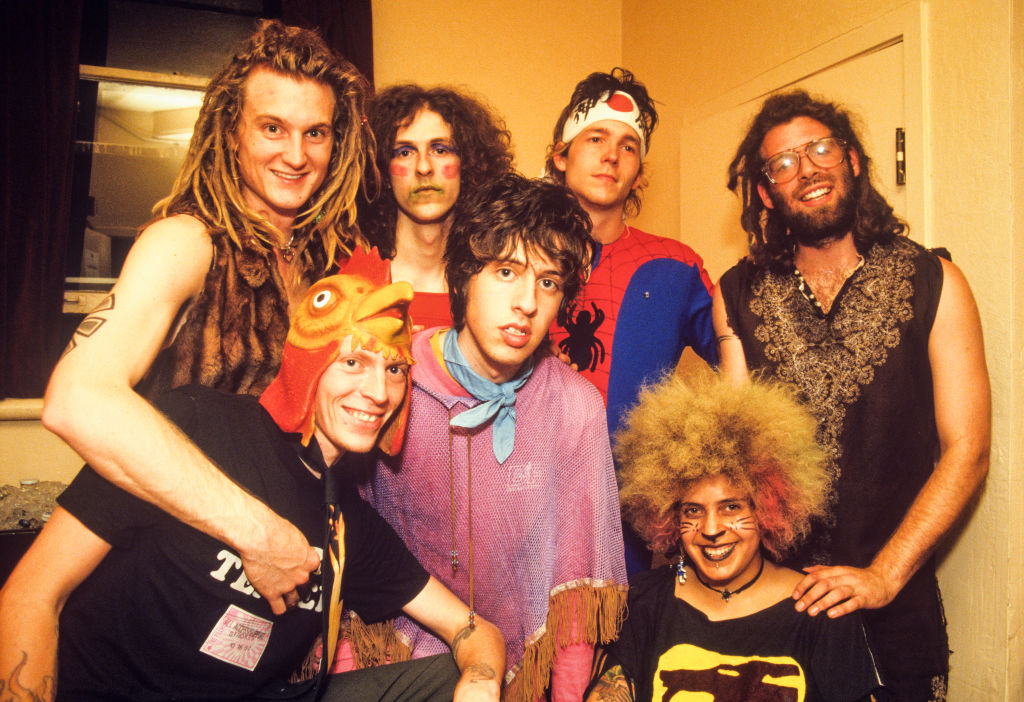 Portrait of The Moldy Peaches (Not in order: Aaron Wilkinson, Jack Dishel, Adam Green, Kimya Dawson, Steven Mertens, Strictly Beats) backstage at The Fillmore in San Francisco, California, USA on 16th October, 2001. (Photo by Anthony Pidgeon/Redferns)