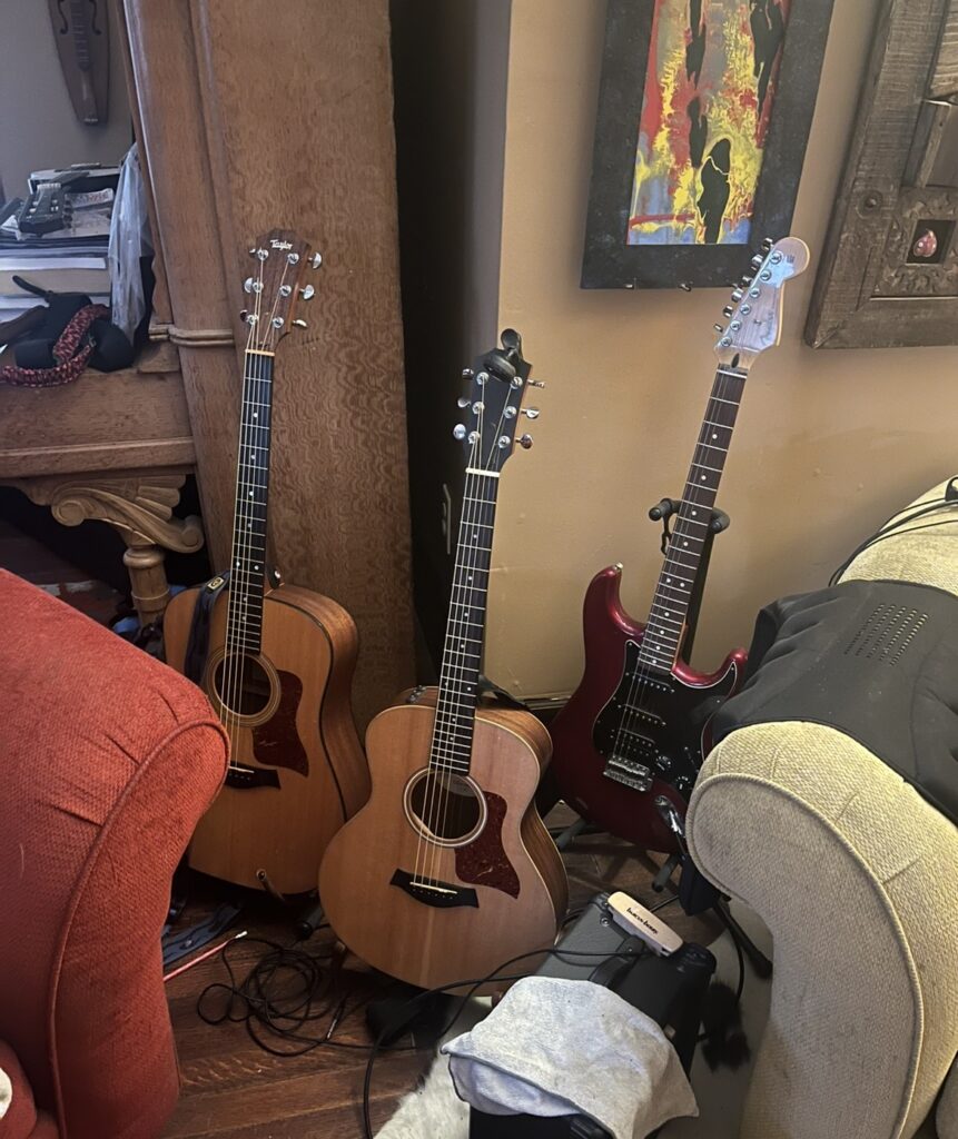 Adding this really quickly, I don’t know what happened with the formatting on the third paragraph second photo, but the image description says “Taylor, Taylor GS Mini, Fender (I think).” It starts above the second photo then goes to the left. The fourth paragraph starts under the third then goes to the second. Don’t know why it did that, whoops!!!!